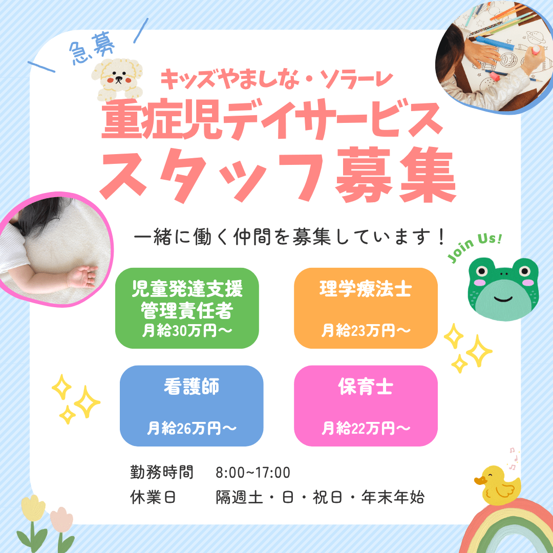 重症児デイサービス「キッズやましな」「ソラーレ」のスタッフを募集しています。